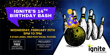 Celebrate Ignite’s 14th birthday with bowling, pizza, games, prizes, and great people. Members and non-members welcome!