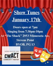 Join Central Wisconsin Area Community Theater (cwACT) for karaoke night! The theme for this evening is show tunes!